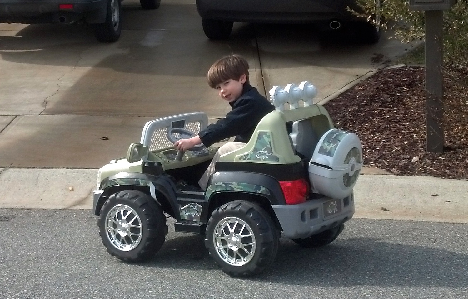 With that, the tot returns his sunglasses to their correct position, and pulls forward with a jump and a slight squeal of miniature tires.  I believe he even sprays me with a pebble or two, leaving me in a mini dust cloud with my mouth still hanging slightly open.  This, I have learned since, Is a toddler peel out…and he does it with style.