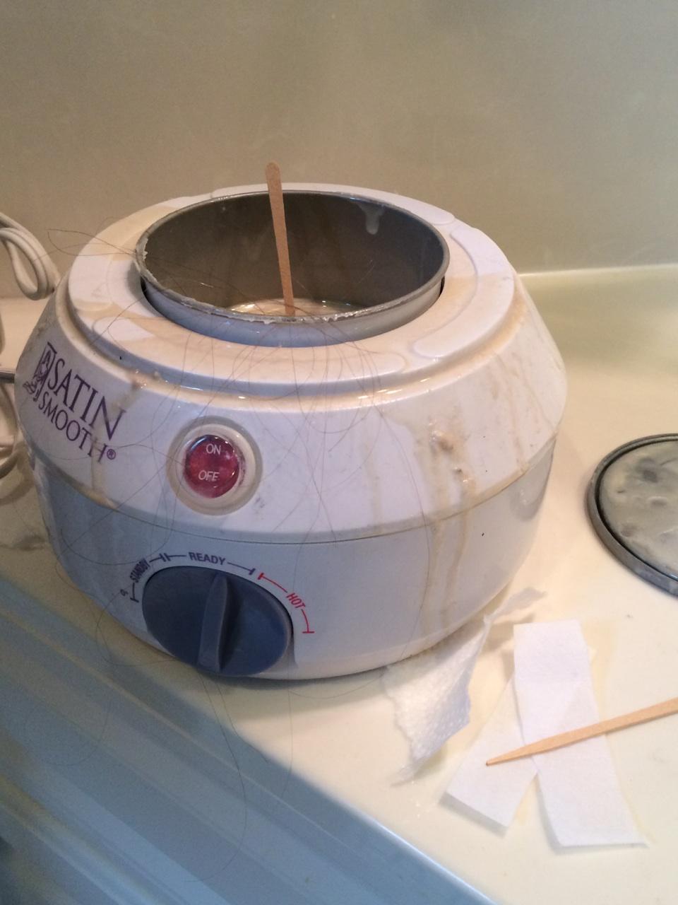 It is a small waxing pot with a wooden stick solidly frozen in the middle.  He sucks in deeply and says all in one breath, “my mommy collects her ear wax in this little bucket and now she has a big glob of it.  Daddy says if I am bad, I’m gonna have to eat it!”
